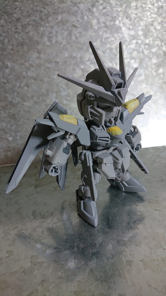 今回はライジングフリーダムを簡単改造。なんちゃってアカツキガンダム風に仕上げてみました。アカツキといえば金色。ということで金を映えさせるためにサーフェンサーは灰色。