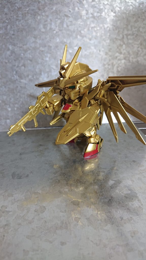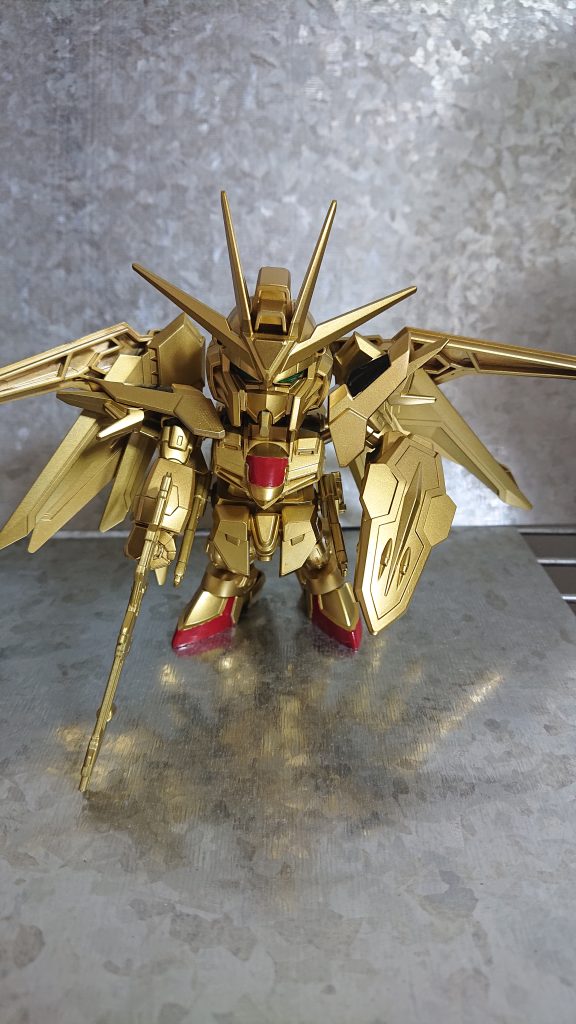 完成。なんちゃってアカツキガンダム完成です。相変わらず細かいところのは手塗りです。塗装手順としましては①グレーサーフェンサー②スーパーファインゴールドを塗ってあります。すべてのビームを反射できてしまうアカツキのキラッと感が出せたかと思います。