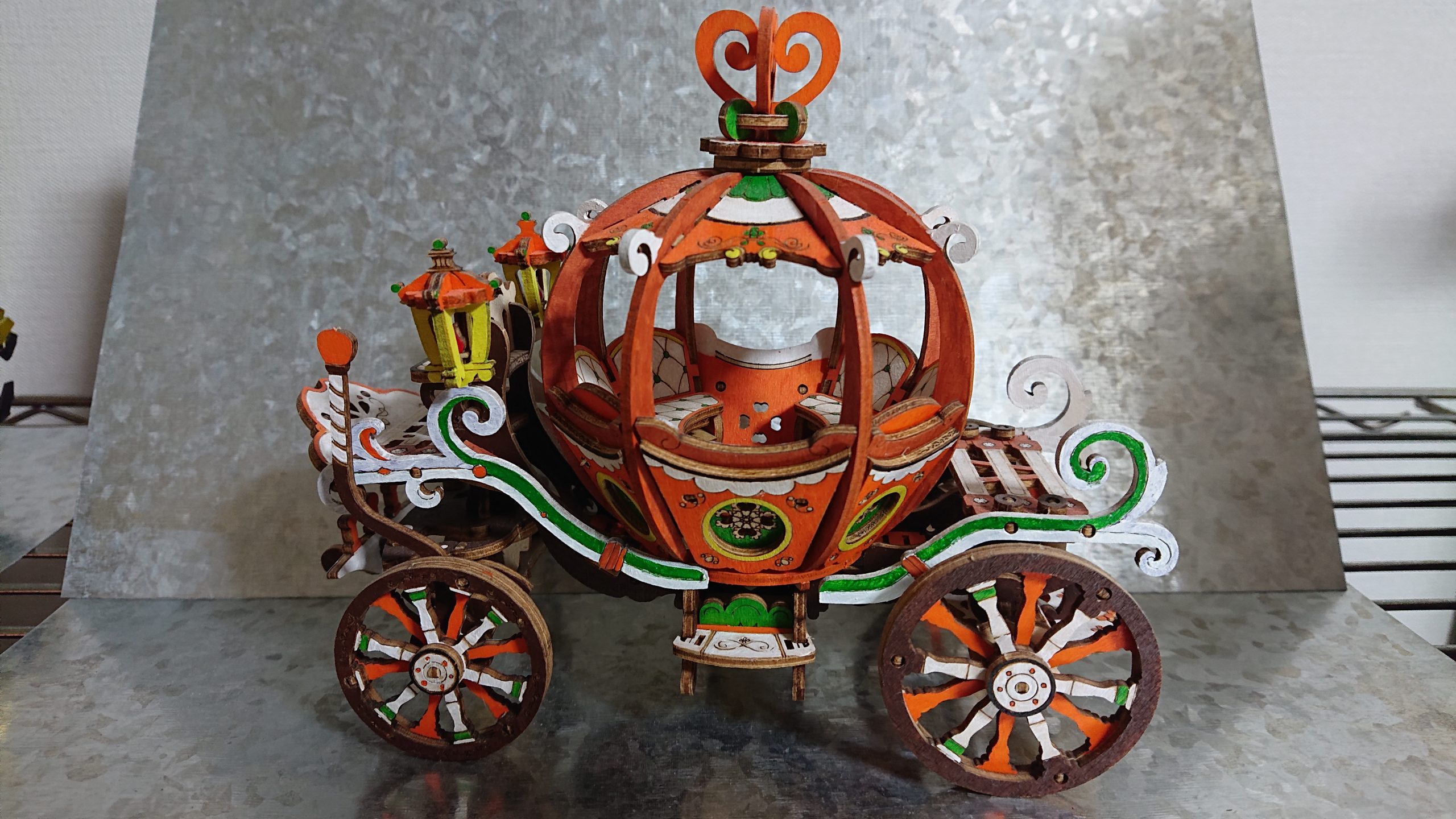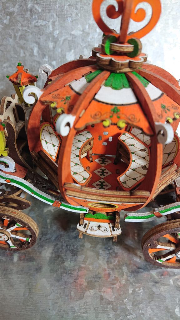 もとはただの馬車だったので簡単にかぼちゃの馬車にしてみました。ちょうど子供とシンデレラ観たのもあってちょうどよかった。色塗りは100均にあったアクリル絵の具。同じく100均の小筆を使用しました。本当はちゃんとしたアクリル絵の具の方がいいのですが、お試しで。